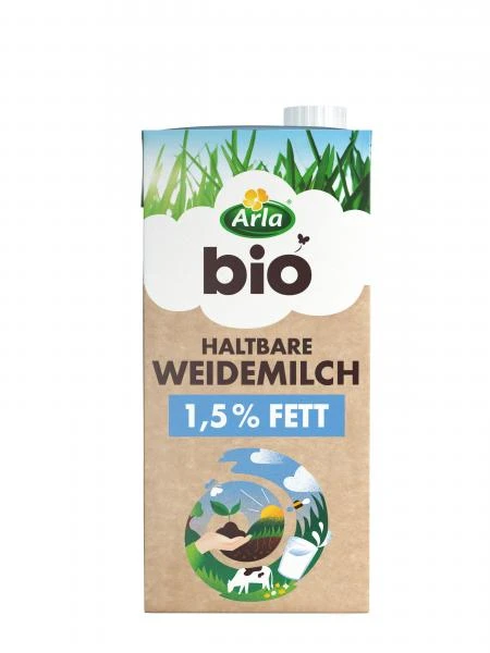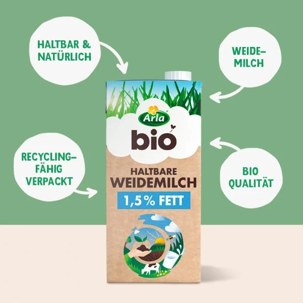Die Arla® Bio haltbare Weidemilch 1,5% Fett ist ideal für deine Vorratskammer. Schonend haltbar gemacht – so bleibt alles Gute der Milch erhalten.