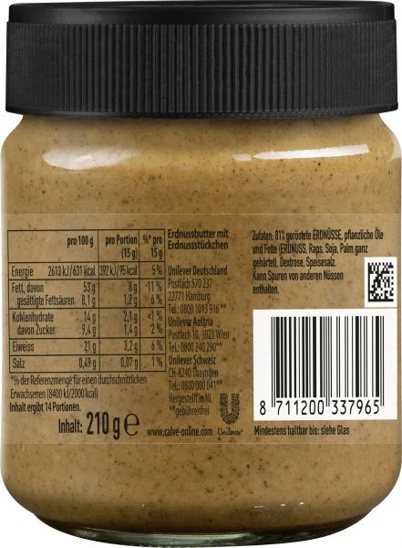 Erdnussbutter “Crunchy” mit knusprigen Erdnuss-Stückchen im 210g Glas. Genießen Sie den herrlichen Erdnuss-Geschmack von Calvé Erdnussbutter. Sie ist viel mehr als nur ein Brotaufstrich. Die beliebte Erdnusscreme aus wertvollen, fein gemahlenen Erdnüssen eignet sich als Aufstrich für Sandwiches, als Zutat in Saucen, Marinaden, Kcuhen, Desserts und Gebäck sowie für warme Speisen. Probieren Sie die leckere Erdnussbutter mit gesunden Fetten und leckeren Erdnuss-Stückchen. Nussiger können Sie den Tag nicht beginnen. Wer Erdnussbutter mag, wird die Erdnussbutter von Calvé aus Holland lieben!