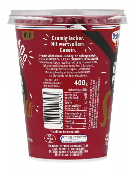 High Protein Schokoladenpudding. 40g Protein pro Becer. Ohne Zuckerzusatz. Fettarm.