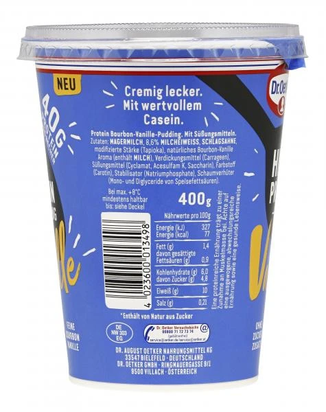 Kompromisslos lecker! Echte Bourbon-Vanille und wertvolles Casein machen den neuen Dr. Oetker High Protein Pudding Vanille zu einem wahren Hochgenuss für ernährungsbewusste Liebhaber des Pudding-Klassikers. Mit 40g Protein pro Becher, ohne Zuckerzusatz* und fettarm ist er die perfekte Ergänzung zu einem aktiven Lifestyle.