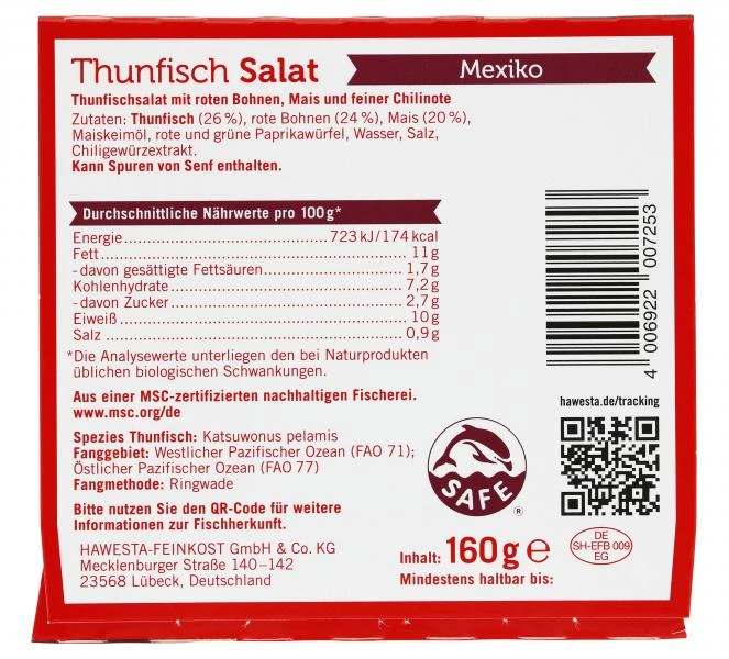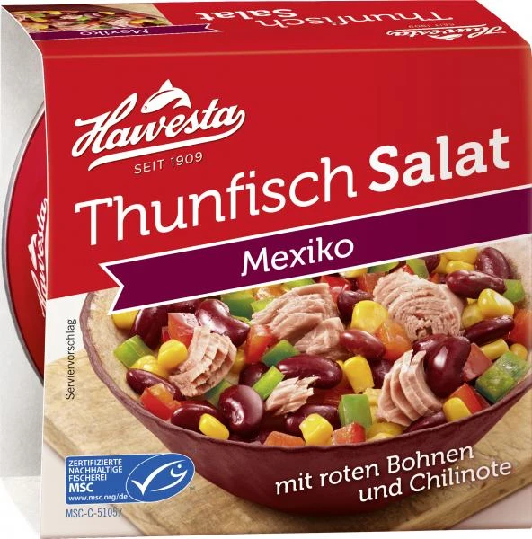 Stark im Geschmack und leicht in der Schärfe: Der Thunfischsalat “Mexiko” kombiniert ausgewählte Zutaten wie rote Bohnen, Mais und Paprika mti leckeren Thunfischstückchen und einem Hauch Chili. Ob pur, als Taco-Füllung oder als Dip zu Tortilla-Chips – er schmeckt in jeder Variation.