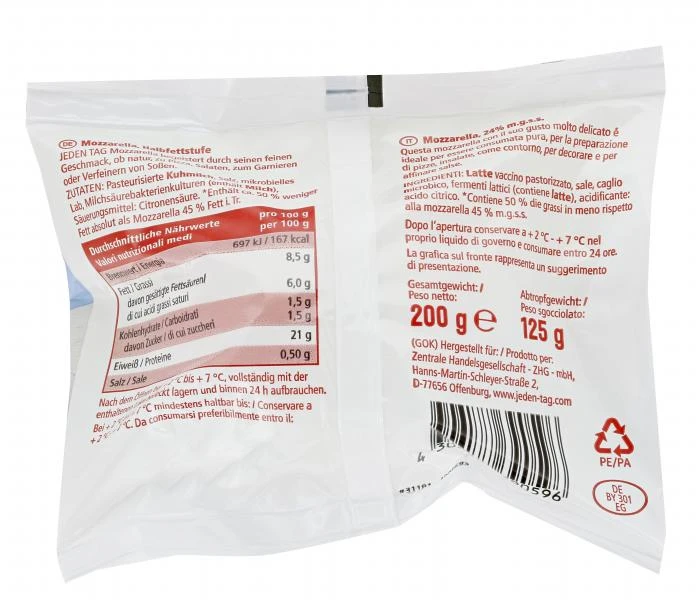 Der Mozzarella mit Halbfettstufe begeistert durch seinen feinen Geschmack, ob natur, zu Pizza, Salaten, zum Garnieren oder Verfeinern von Soßen.