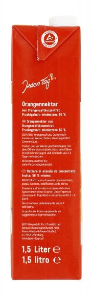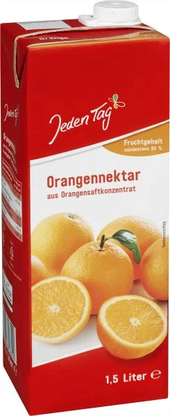 Orangennektar aus Orangensaftkonzentrat, mit einem Fruchtgehalt von mindestens 50%.