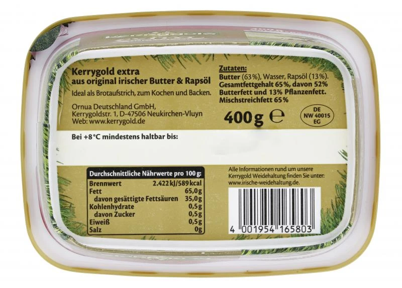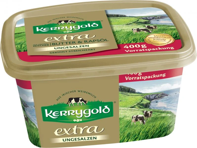 Kerrygold extra ist eine Kreation aus Original Irischer Butter und wertvollem Rapsöl. Sie ist direkt aus dem Kühlschrank streichfähig und ist durch den wieder verschließbaren Becher enorm praktisch. Natürlich lecker – ohne Zusatzstoffe! Sie enthält durch den Rapsölanteil 65% Fett. Ideal als Brotaufstrich, zum Kochen und Backen. Die Kreation enthält wertvolles Rapsöl, das vor allem wegen seines hohen Omega-3-Gehaltes besonders gesund ist.