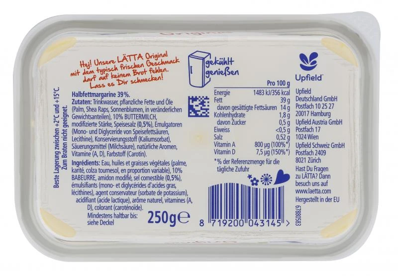 Mit ihrem typisch frischen und leichten Geschmack sorgt Lätta Original für einen perfekten Start in deinen Tag. Sie wird mit bestem Rapsöl und Buttermilch zubereitet.