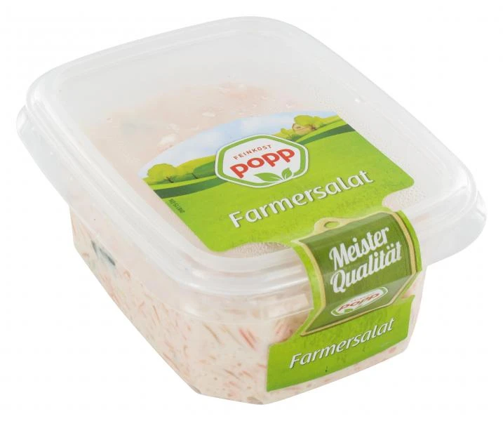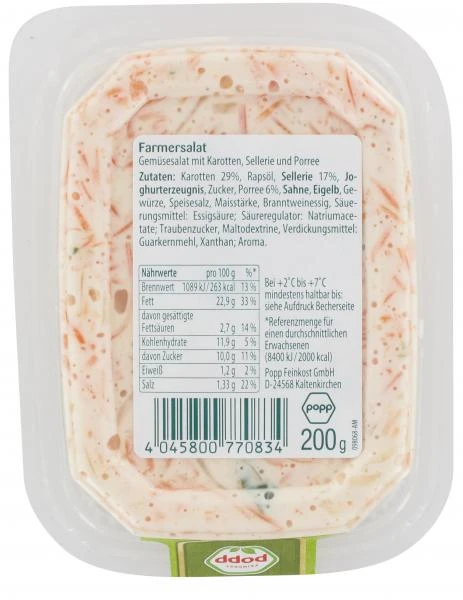Beliebt bei Groß und Klein: Der klassische Farmersalat schmeckt z.B. auch mal unter einer Scheibe Käse auf frischem Brot. Mit Karotten, Sellerie und Porree in cremiger Joghurtsauce nimmt er jeden Gaumen für sich ein. Ohne Zusatz von Konservierungsstoffen.
