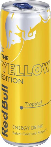 Der Red Bull Energy Drink Yellow Edition mit dem einzigartigen Geschmack von Tropical in der unverwechselbaren gelben 250ml Dose.Red Bull verleiht Flüüügel. Inspiriert von funktionalen Getränken aus Fernost gründete Dietrich Mateschitz Mitte der 1980er Jahre Red Bull. Er entwickelte ein neues Produkt und ein einzigartiges Marketingkonzept und brachte Red Bull Energy Drink am 1. April 1987 in Österreich auf den Markt. Eine neue Produktkategorie – Energy Drinks – wurde geboren. Wann trinken?Weltweit geschätzt im Spitzensport, beim Studieren, in stark fordernden Berufen sowie bei langen Autofahrten. Was ist in der Dose? Koffein: Koffein war bereits in alten Zivilisationen bekannt. Sie konsumierten es aus natürlichen Quellen wie Tee, Kaffee, Kakaobohnen und Kolanuss und schätzten seine anregende Wirkungen auf den menschlichen Körper. Taurin: Taurin ist eine Aminosäure, die natürlich im menschlichen Körper vorkommt und in der täglichen Ernährung enthalten ist. Es ist an einer Vielzahl von biologischen Prozessen beteiligt. Vitamine der B-Gruppe: Vitamine sind essentielle Mikronährstoffe, die zur Aufrechterhaltung normaler Körperfunktionen benötigt werden. Zucker: Red Bull Energy Drink enthält Zucker der aus Zuckerrüben hergestellt. Gebirgswasser: Wasser ist natürlich ein Hauptbestandteil von Red Bull.