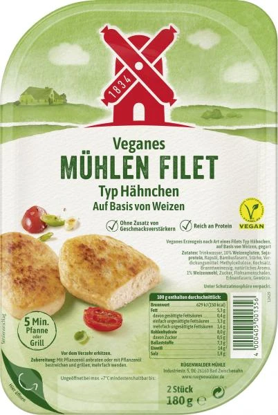 Lust auf Fleisch? Das geht auch pflanzlich!. Das Vegane Mühlen Filet ähnelt einem klassischen Hähnchenfilet und lässt sich genauso lecker und vielfältig zubereiten. Ob auf dem Grill oder in der Pfanne. Ob mit Pasta oder Püree, als Club Sandwich oder im Salat.