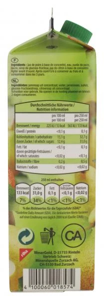 Birnennektar teilweise aus Fruchtsaftkonzentrat mit einem Fruchtgehalt von mindestens 50%.